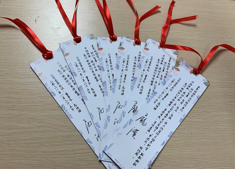 公司黨委書記、董事長、總經理龐漢為活動紀念品定制版書簽寫寄語