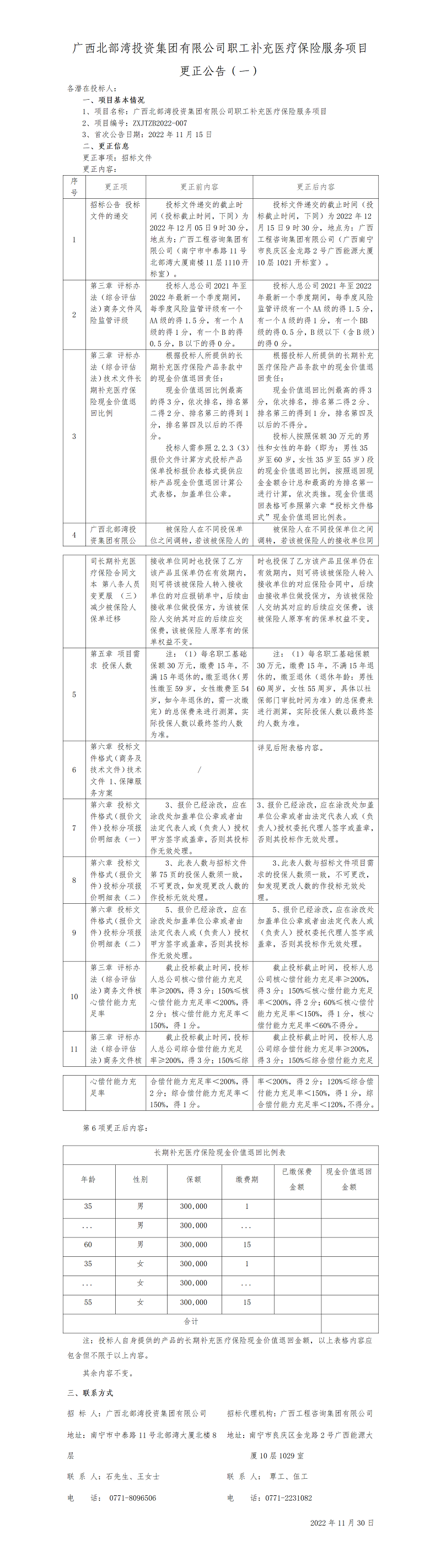 廣西北部灣投資集團有限公司職工補充醫療保險服務項目更正公告(一)