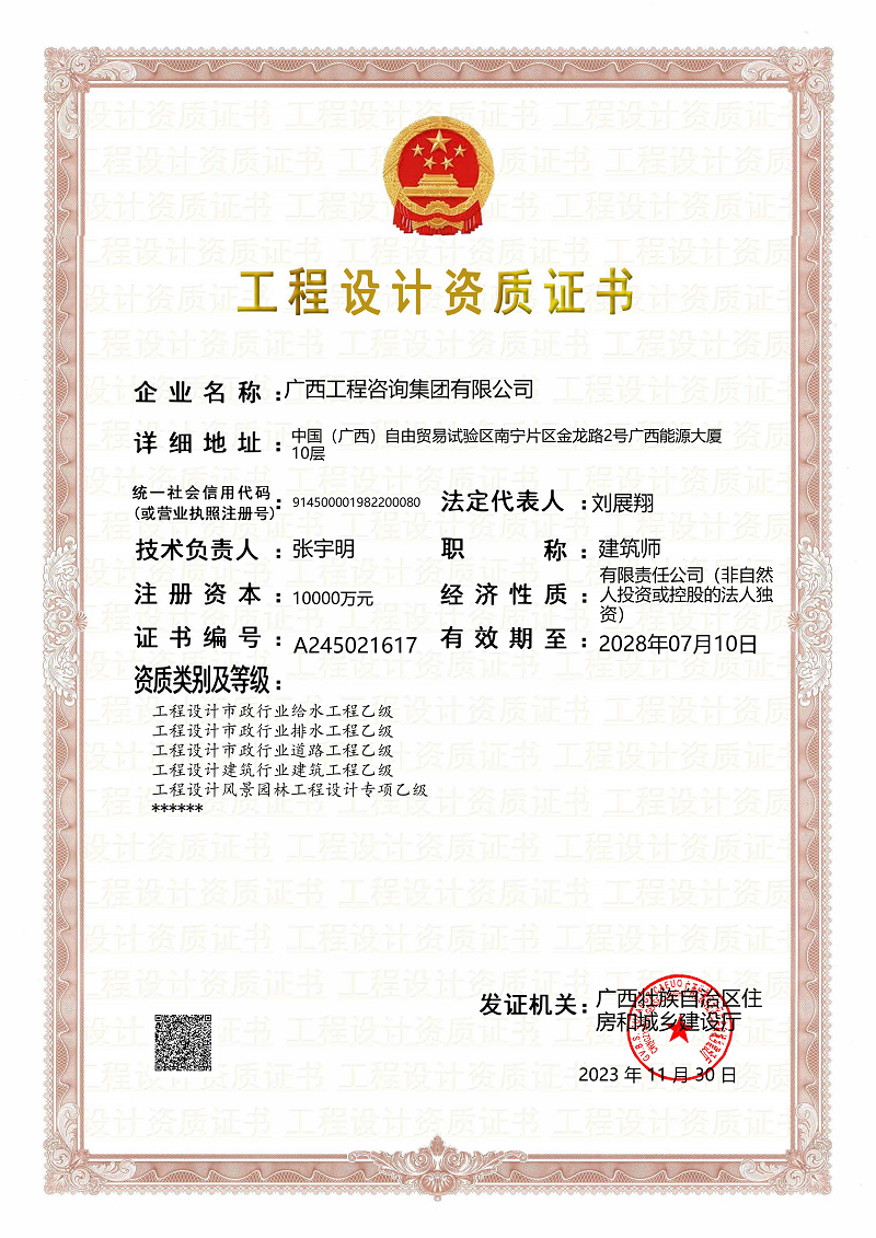 工程設計乙級資質(市政行業給水工程、市政行業排水工程、市政行業道路工程、建筑行業建筑工程、風景園林工程設計)