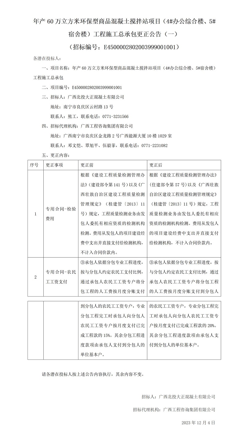 年產(chǎn)60萬立方米環(huán)保型商品混凝土攪拌站項目(4#辦公綜合樓、5#宿舍樓)工程施工總承包更正公告(一) (招標編號:E4500002802003999001001