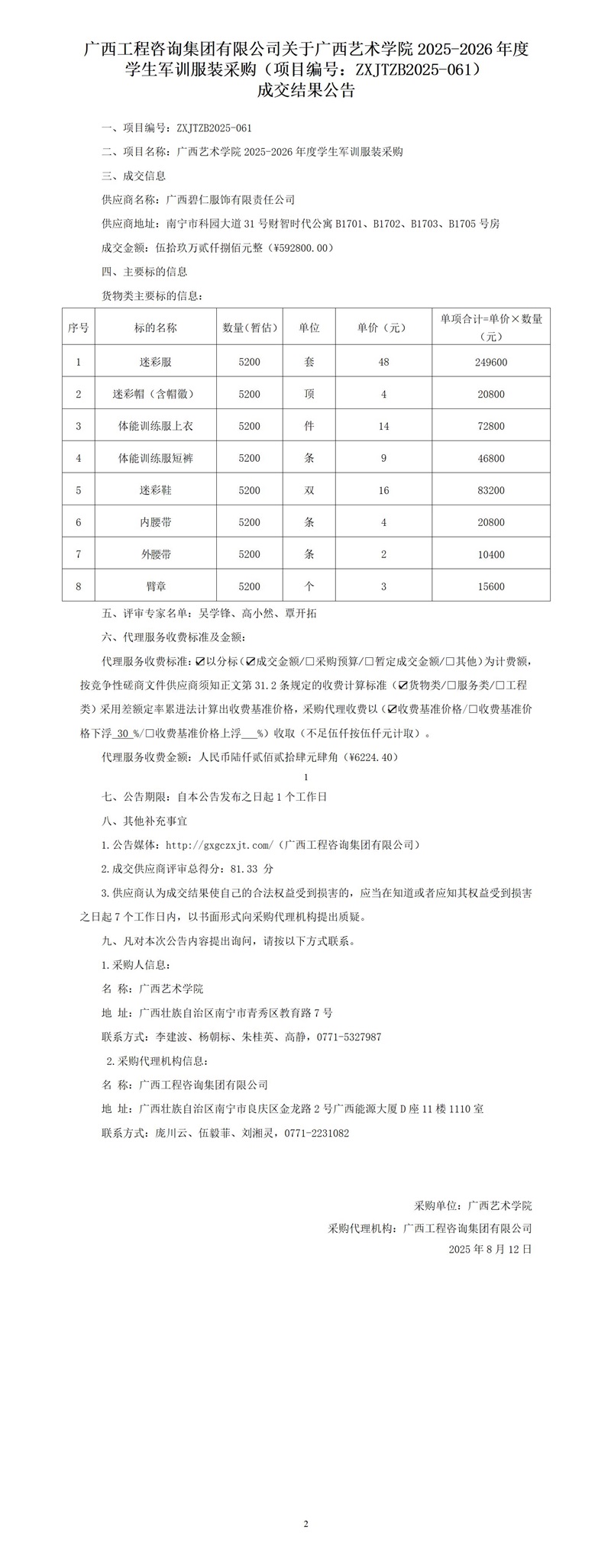廣西工程咨詢集團有限公司關于廣西藝術學院 2025-2026年度學生軍訓服裝采購(項目編號:ZXJTZB2025-061)成交結果公告